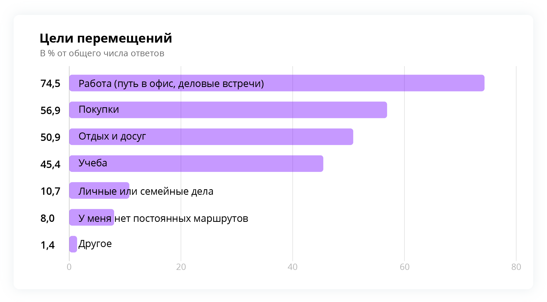 Среди главных целей рутинных поездок читатели «Бумаги» называют работу, покупки, а также личные и семейные дела. Кроме того, часть опрошенных петербуржцев перемещается по городу для досуга и отдыха. Поездки по учебе совершает низкий процент горожан — это можно объяснить тем, что из-за пандемии в Петербурге преобладает дистанционный формат обучения. Кроме того, число студентов среди участников опроса невелико.