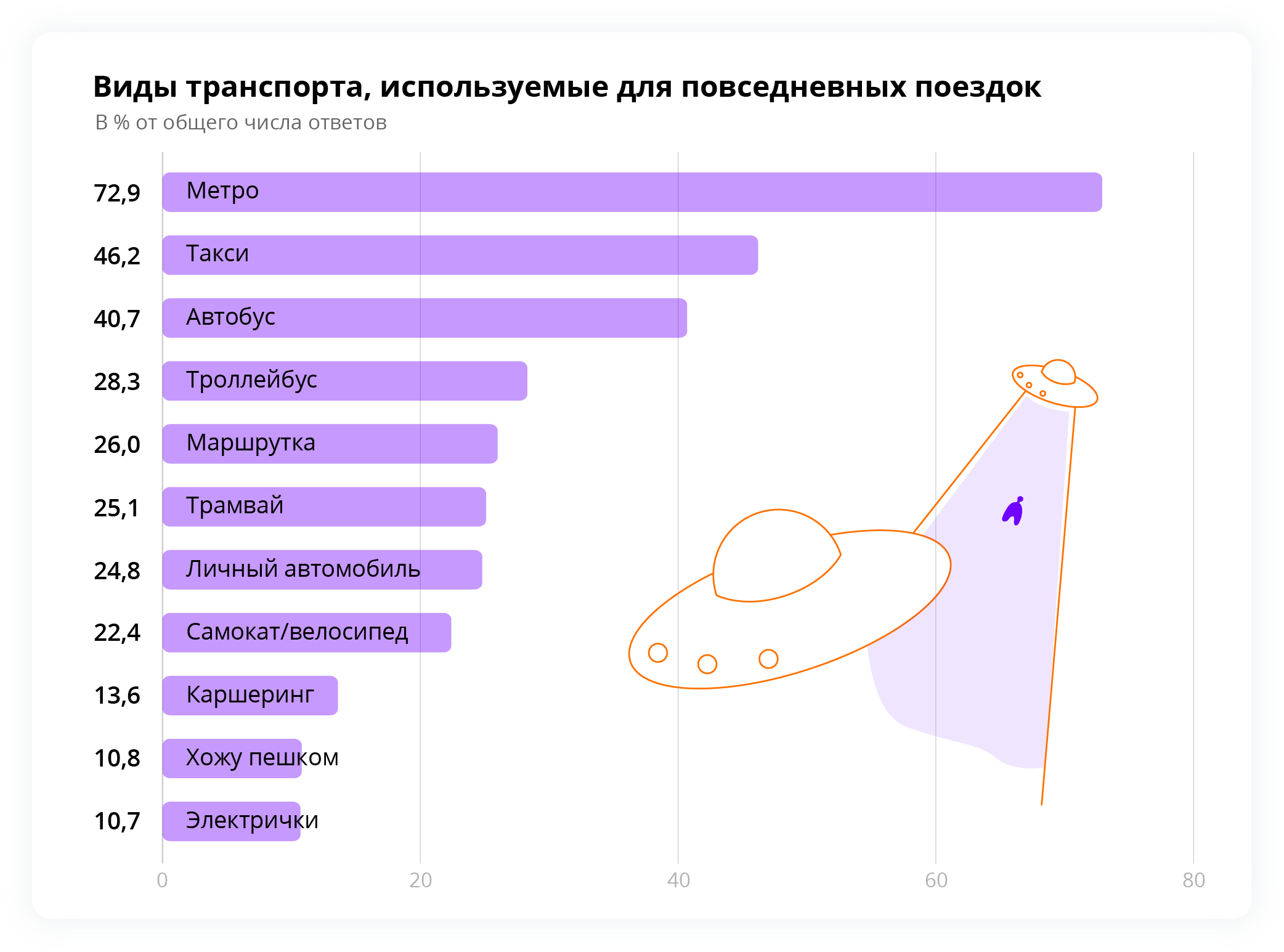 Для ежедневных поездок большинство горожан предпочитают метро, такси и автобус. Респонденты отмечали, что пользуясь общественным транспортом, они не беспокоятся о парковке, страховке и бензине.