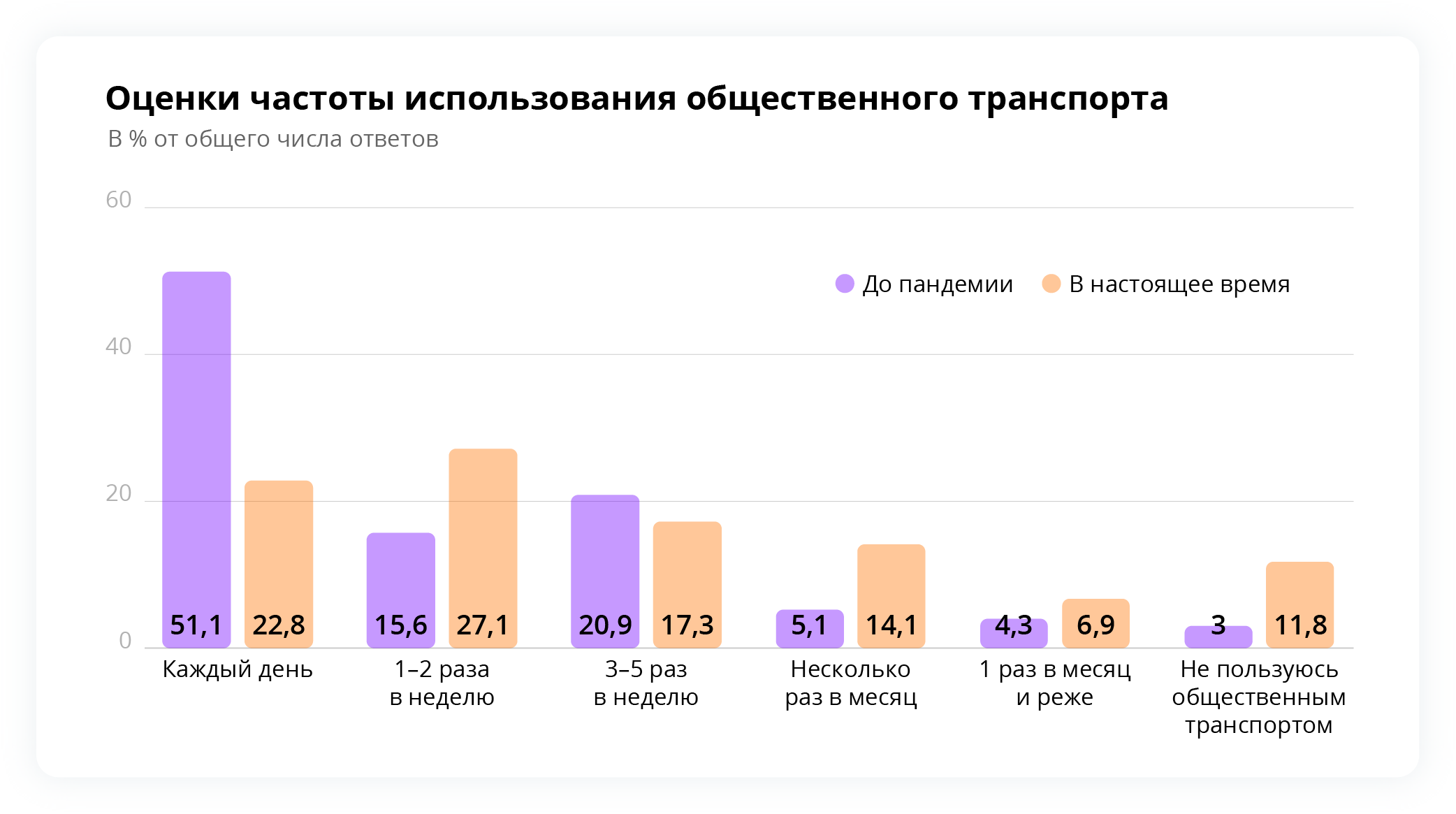 Количество петербуржцев, которые пользуются общественным транспортом каждый день, во время пандемии сократилось более чем в два раза (с 51 % до 23 %). Кроме того, в этот период количество петербуржцев, которые не ездят на общественном транспорте вообще, выросло на 9 %. Это можно объяснить боязнью заразиться COVID-19.