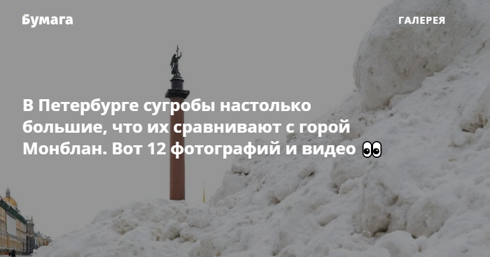 «Бумага» показывает 12 фотографий многометровых сугробов из соцсетей, а также видео с «сугробом Беглова».