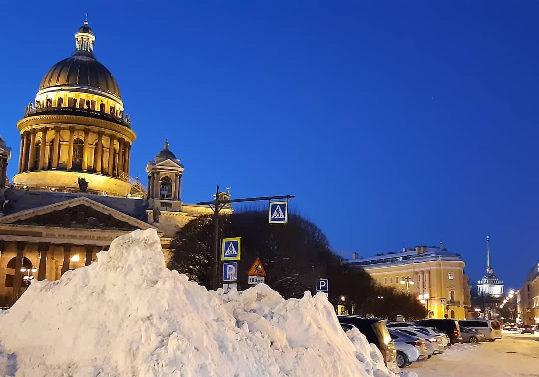 После четырех дней снегопадов на улицах Петербурга образовались огромные сугробы. Некоторые из них достигают трех метров в высоту. Петербуржцы жалуются на плохую уборку, гору снега на Дворцовой площади даже прозвали «сугробом Беглова» — в честь губернатора. Горожане сравнивают снежные кучи с «белой горой» Монблан в Альпах и фотографируются на них.