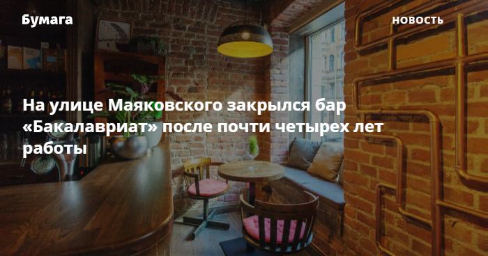 На улице Маяковского, 10 закрылся бар «Бакалавриат». Об этом в своем телеграм-канале сообщил журналист Арсений Веснин, в баре «Бумаге» подтвердили информацию о закрытии.