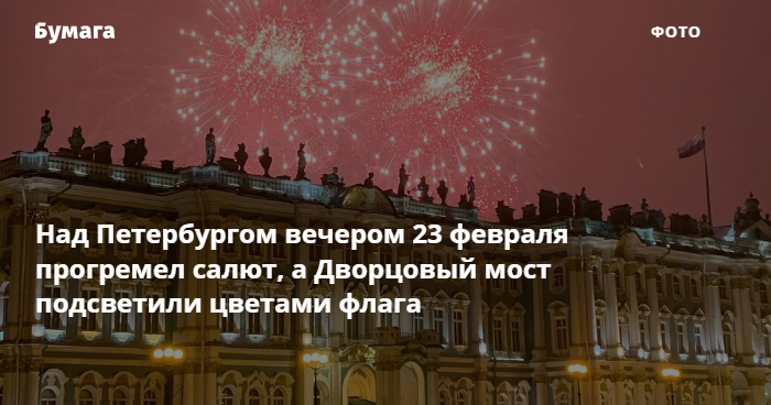 Над Петербургом вечером 23 февраля прогремел салют, а Дворцовый мост подсветили цветами флага