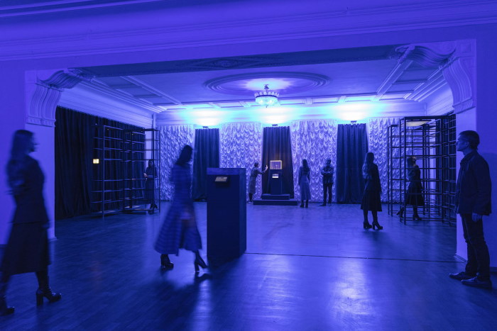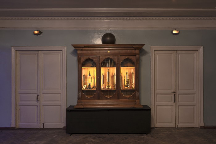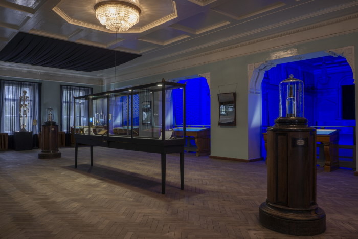 При поддержке ГЦСИ Петербурга художник интегрировал в ранее пустые помещения Итальянского дворца экспозицию, которая сочетает натурфилософское мировоззрение и эзотерические артефакты: реликварии, свитки с комбинаторными системами (они напечатаны на материале, который не разлагается минимум 700 лет) и даже человеческий скелет. В соседнем помещении — бывший актовый зал, залитый синим цветом. В нем вы найдете прототип маятника Фуко.