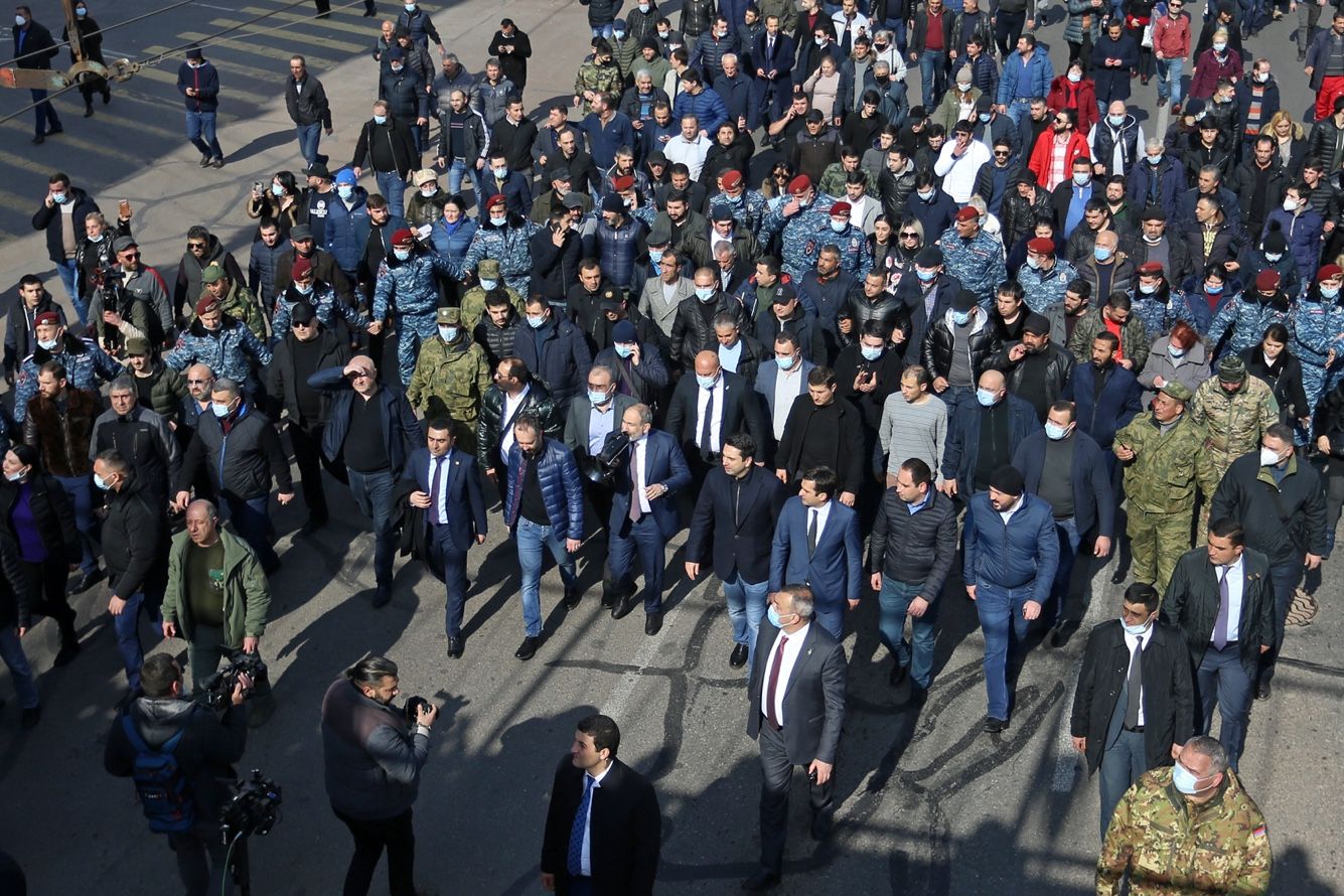 Помимо сторонников Пашиняна, в центр Еревана вышли и его противники. Оппозиционное «Движение по спасению родины» организовало митинг на площади Свободы. Поддержать военных призвали второй президент страны Роберт Кочарян (занимал этот пост в 1998-2008 годах) и Республиканская партия Армении, возглавляемая третьим президентом Сержем Саргсяном (занимал этот пост в 2008-2018 годах). Кочарян заявил, что «проигравшие в войне [в Нагорном Карабахе] и сдавшие земли власти должны уйти». Отставки Пашиняна также потребовала парламентская оппозиция — партии «Процветающая Армения» и «Светлая Армения».