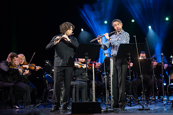 © Алексей Молчановский / Предоставлено пресс-службой РКА Ареной для особо разноголосой переклички стал концерт-открытие. Первая часть его уникальной программы включала пять сочинений современных авторов. Среди них Пьеса для трех альтов и струнного ансамбля китайского композитора Чжии Вана предоставляла соло хозяину фестиваля, Фантазия на ирландские темы британского флейтиста и аранжировщика Гарета МакЛернона, в которой он солировал вместе с Максимом Рубцовым из РНО, демонстрировала пораженной публике многочисленной флейтовое семейство, от пикколо до баса, а Enigma для органетто (на этом загадочном инструменте играла Каталина Висенс из Швейцарии) и струнных белорусско-германского автора Валерия Воронова была просто очень хороша.