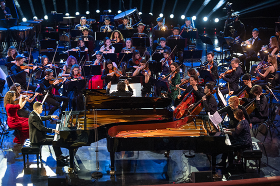 © Алексей Молчановский / Предоставлено пресс-службой РКА После этого выкатились два рояля, на которых Ксения Башмет и Андрей Гугнин доблестно сражались с двухрояльным концертом Макса Бруха (1912), отличающимся невероятным пафосом и столь же невероятной тональностью ля-бемоль минор. Мне кажется, они едва сдерживались от смеха. Затем Вадим Репин, наоборот, серьезно и чувствительно играл Второй скрипичный концерт Прокофьева, ведя, а иногда и таща за собой Юношеский оркестр (сменивший к тому моменту на сцене «Солистов Москвы»). А потом наступило время оперной дивы — Аида Гарифуллина ко всеобщему счастью сверкнула арией Русалки, ариозо Иоланты и Вальсом Мюзетты, каким-то образом совпав с оркестром, хоть сидящий за пультом Башмет ни разу не повернул к ней головы.