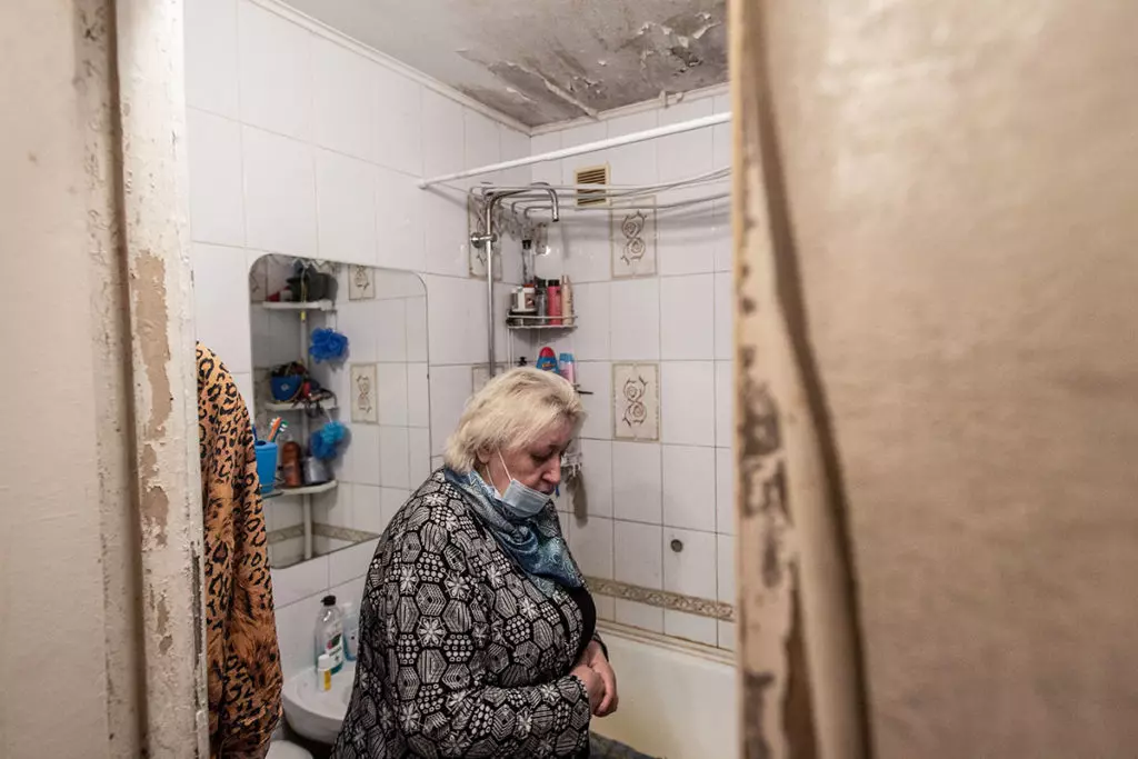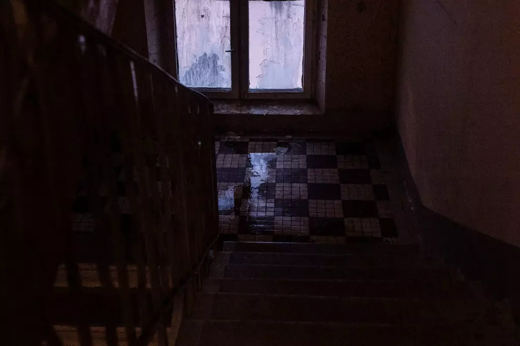 Дарья выбивает заледеневшую входную дверь и предупреждает: «Не трогайте ничего, здесь плесень». В подъезде в нос ударяет подвальная гниль. Поднимаясь, Дарья деловито объясняет, как уворачиваться от луж на лестничных площадках: «Здесь подальше, посуше. Это у нас в порядке вещей, не убираются уже очень-очень давно».