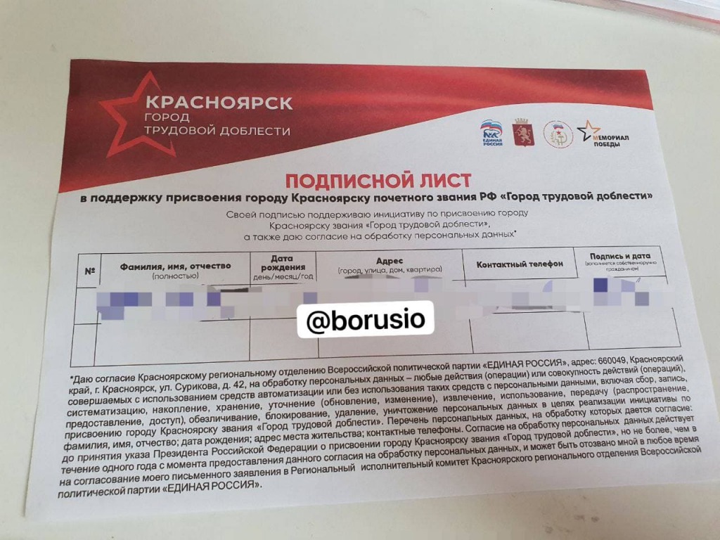 В красноярских школах начали выдавать «подписные листы» в поддержку присвоения городу звания «Город трудовой доблести». На ней обозначена символика «Единой России». Копию такой анкеты опубликовал телеграм-канал «Борус».