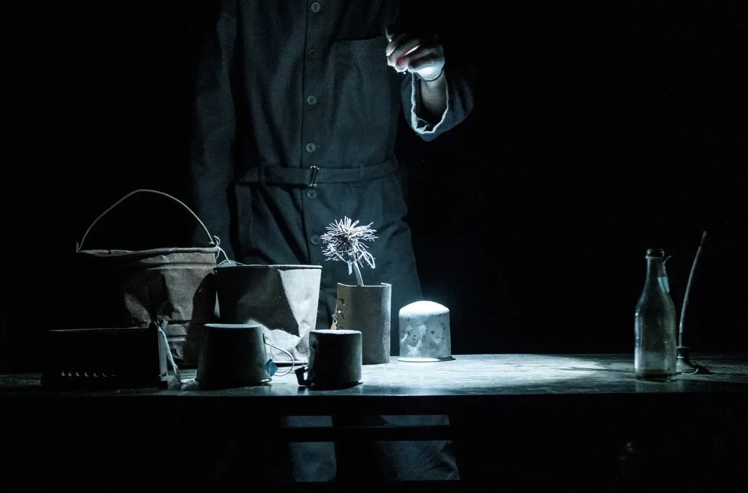 На длинном столе вдоль сцены — вещи, объекты. Их привезли с урановых рудников Колымы и Чукотки, нашли в лагерных бараках, на свалках, в развалинах. Теперь они — участники спектакля.