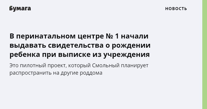 В перинатальном центре № 1 начали выдавать свидетельства о рождении ребенка при выписке из учреждения. «Бумага»