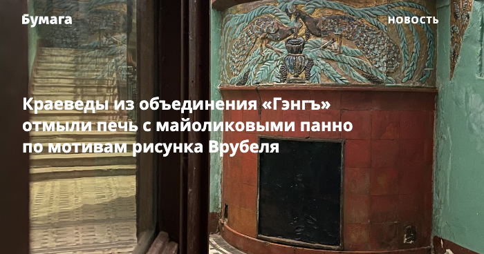 Участники краеведческой ячейки «Гэнгъ» отмыли печь производства Петра Ваулина с панно по мотивам рисунка Врубеля в парадной доходного дома на Клинском проспекте. Об этом в своем инстаграме сообщила соосновательница проекта Ксения Сидорина.