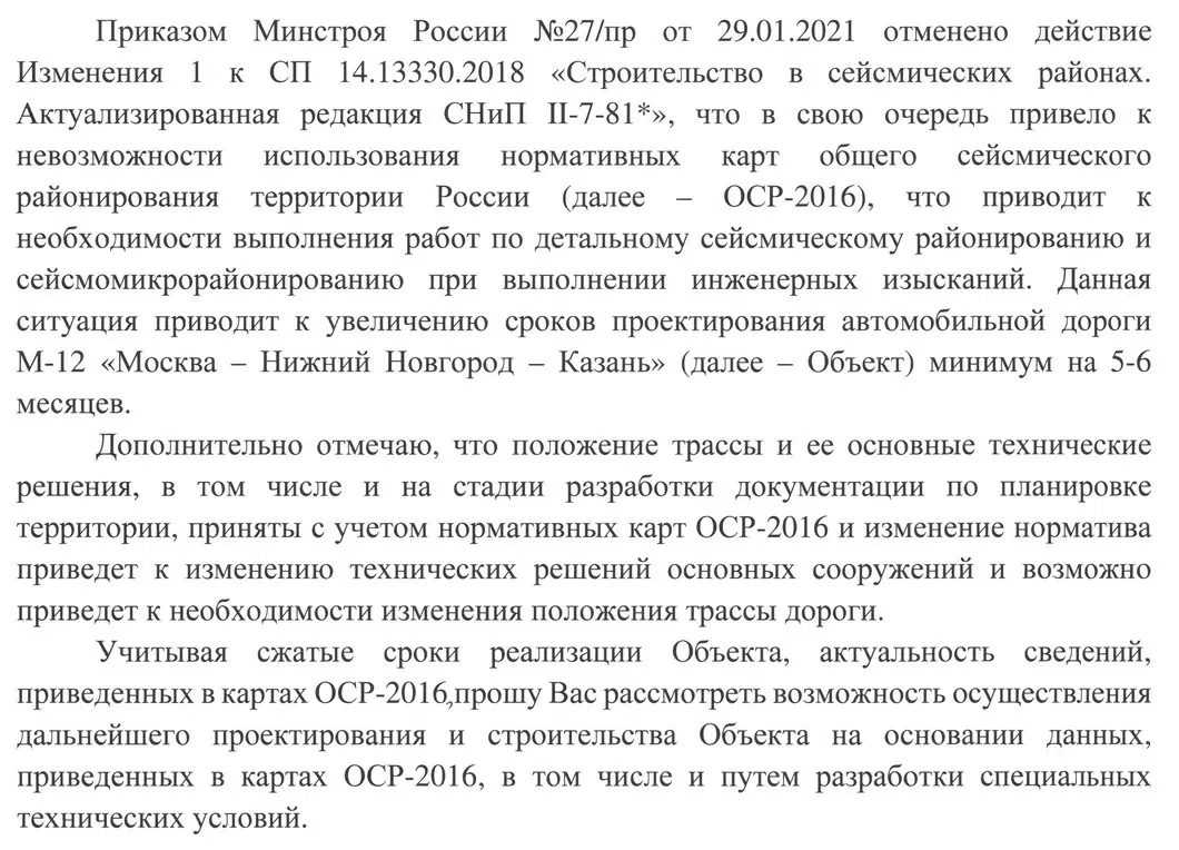 Что касается стоимости трассы М12, то за сутки до этого совещания председатель правления ГК «Автодор» Вячеслав Петрушенко отправил министру Иреку Файзулину выдающее крайнюю обеспокоенность письмо — он просит разрешить ему в порядке исключения продолжать стройку по отмененным картам ОСР-2016. Потому что теперь все дороже, сроки летят к черту и, возможно, придется изменять саму трассу! О существовании письма ГК «Автодор» (входящий № 16906/МС от 18.02.2021) сообщил источник в Минстрое.