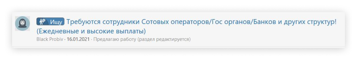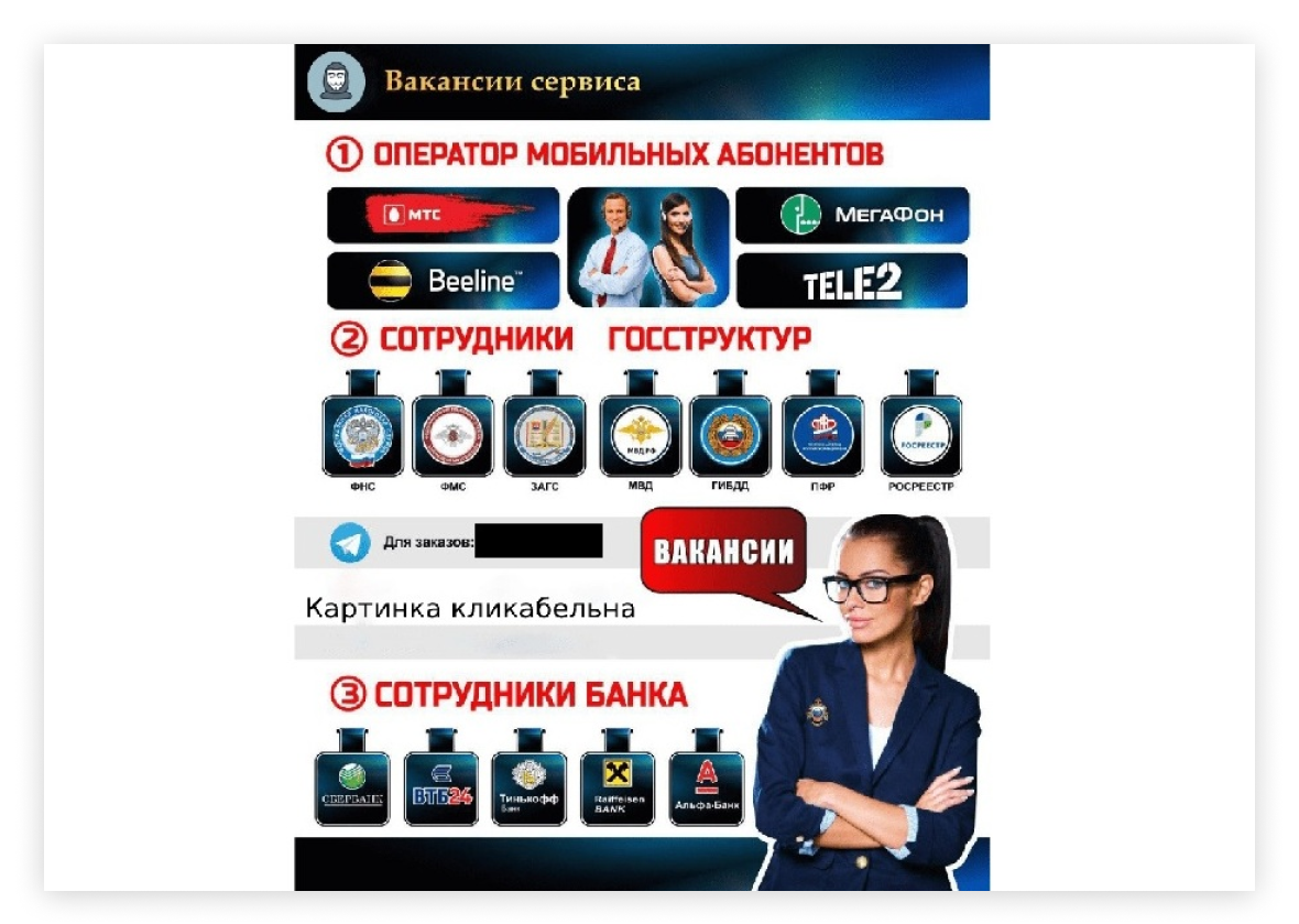 * Сотрудники силовых ведомств, которые раньше поставляли данные, «залегли на дно», рассказали The Bell несколько человек, работающих на рынке. Поэтому у сервисов, торгующих данными, возникла нехватка информации. На площадках стали появляться объявления о поиске источников в офисах сотовых операторов (геолокация, СМС, звонки), в ФНС (налоговая отчетность), МВД (судимости), ГИБДД (транспорт и штрафы), ЗАГС (родственные связи), Росреестре (недвижимость) и других госструктурах. «Выхлоп» от таких объявлений — минимальный, поскольку «все смелые уже занимались этим, а несмелые сейчас испуганы еще сильнее», — рассказывает один из собеседников.