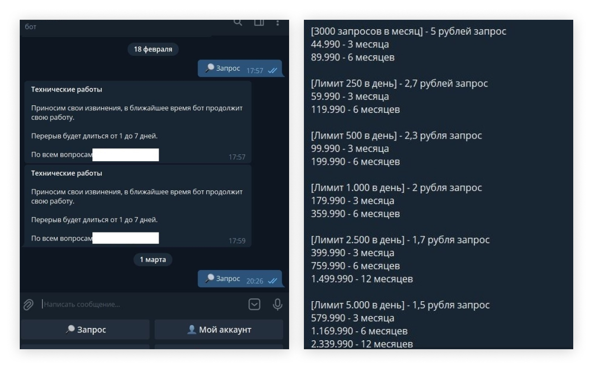 Погиб крупный проект для «пробива» в Telegram, запущенный незадолго до выхода расследования в середине декабря. Несколько недель сервис продавал оптовые подписки за миллионы рублей, при которых каждый запрос обходился бы в 1,5–5 рублей вместо примерно 200 рублей разово (по данным The Bell, реальные покупатели были), но к марту «лег» окончательно. По словам одного из собеседников The Bell на рынке «пробива», «кидать никого не планировалось», а прекращение работы связано только с массовыми проверками силовиков на предмет торговли данными. Курируют их сотрудники центрального и региональных аппаратов ФСБ.