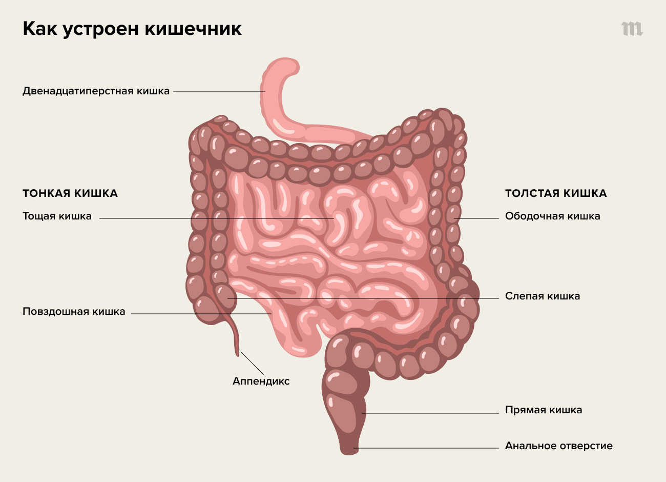 Один конец кишечника — это тонкая кишка (она делится на двенадцатиперстную кишку, которая соединена с желудком, тощую кишку и подвздошную кишку). Затем идет толстая кишка (она делится на слепую, ободочную и прямую). Прямая кишка заканчивается анальным отверстием. На стыке толстой и тонкой кишки находится аппендикс (червеобразный отросток).