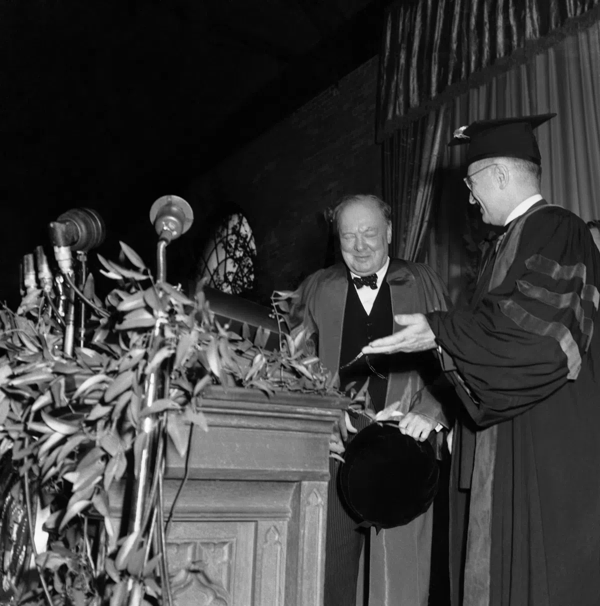 Тысячи людей собрались, чтобы увидеть Трумэна и Черчилля. После обеда в доме президента колледжа гости отправились в спортивный зал, существующий и поныне. Другого помещения, способного вместить всех желающих, не нашлось. Во вступительном слове Трумэн назвал Черчилля одним из выдающихся людей эпохи.