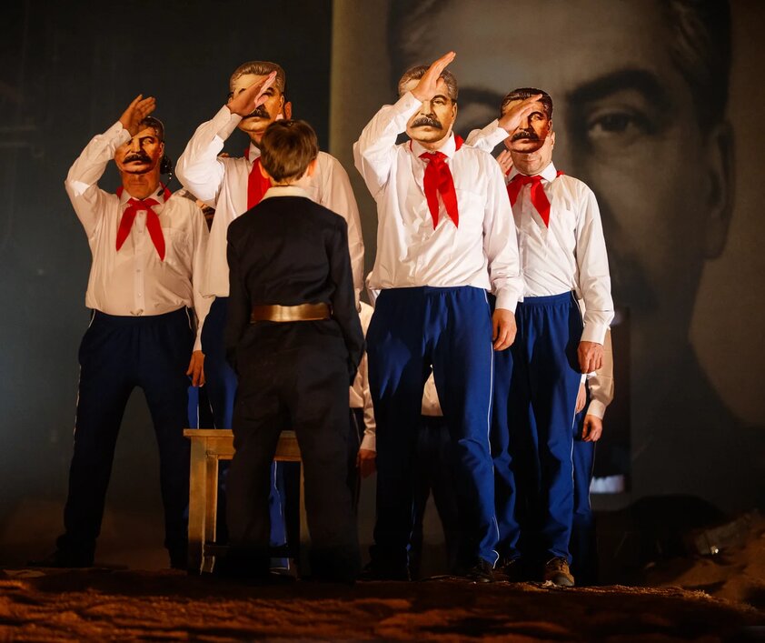 Еще один яркий образ, воплощенный в сценографии, — Сталин. По сюжету Иван Ильич Туб родился в довоенном Ленинграде и изначально носил фамилию Тубин, он сын авиаконструктора-коммуниста, которого арестовали во время Большого террора. При этом маленький Ваня очарован личностью Сталина, как и почти все дети его поколения.