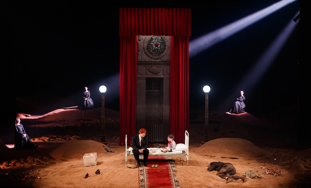 Одни из ярких образов спектакля — Сталин, съедающий людей, и сыплющийся «с неба» песок