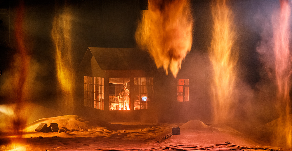 Действие спектакля частично разворачивается в «загадочном пространстве, похожем то ли на пустыню, то ли на заброшенный пляж, то ли на гигантскую песочницу», говорится на сайте театра. Зрители не знают, где это: подсказка могла бы быть в предыдущих частях, но их в театре перескочили. Для создания эффекта пустыни в начале спектакля на сцену как бы с неба сыплется около 3 тонн «песка». На самом деле в оформлении спектакля используется не настоящий песок, а пробочная крошка, после показа ее собирают и затем используют снова.