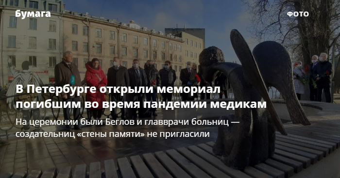 На набережной реки Карповки в Петербурге открыли мемориал медикам, погибшим во время пандемии. Об этом 3 марта сообщает пресс-служба администрации города.