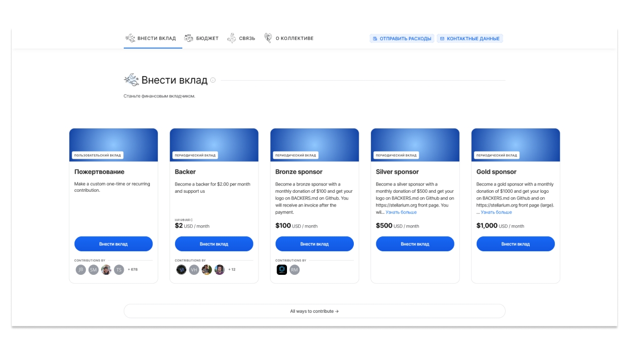 Здесь на выбор несколько вариантов финансовой поддержки. Можно сделать разовое пожертвование (пользовательский вклад). Или выбрать регулярную поддержку (периодический вклад). У этого варианта есть 4 уровня, от 2 до 1000 долларов США в месяц.