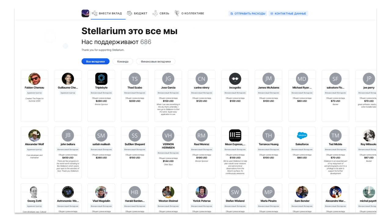 Здесь видно всех, кто поддерживает проект. Почти 700 человек, это же здорово! Больше людей – больше возможностей для развития проекта. Для проектов с открытым кодом это очень важно.