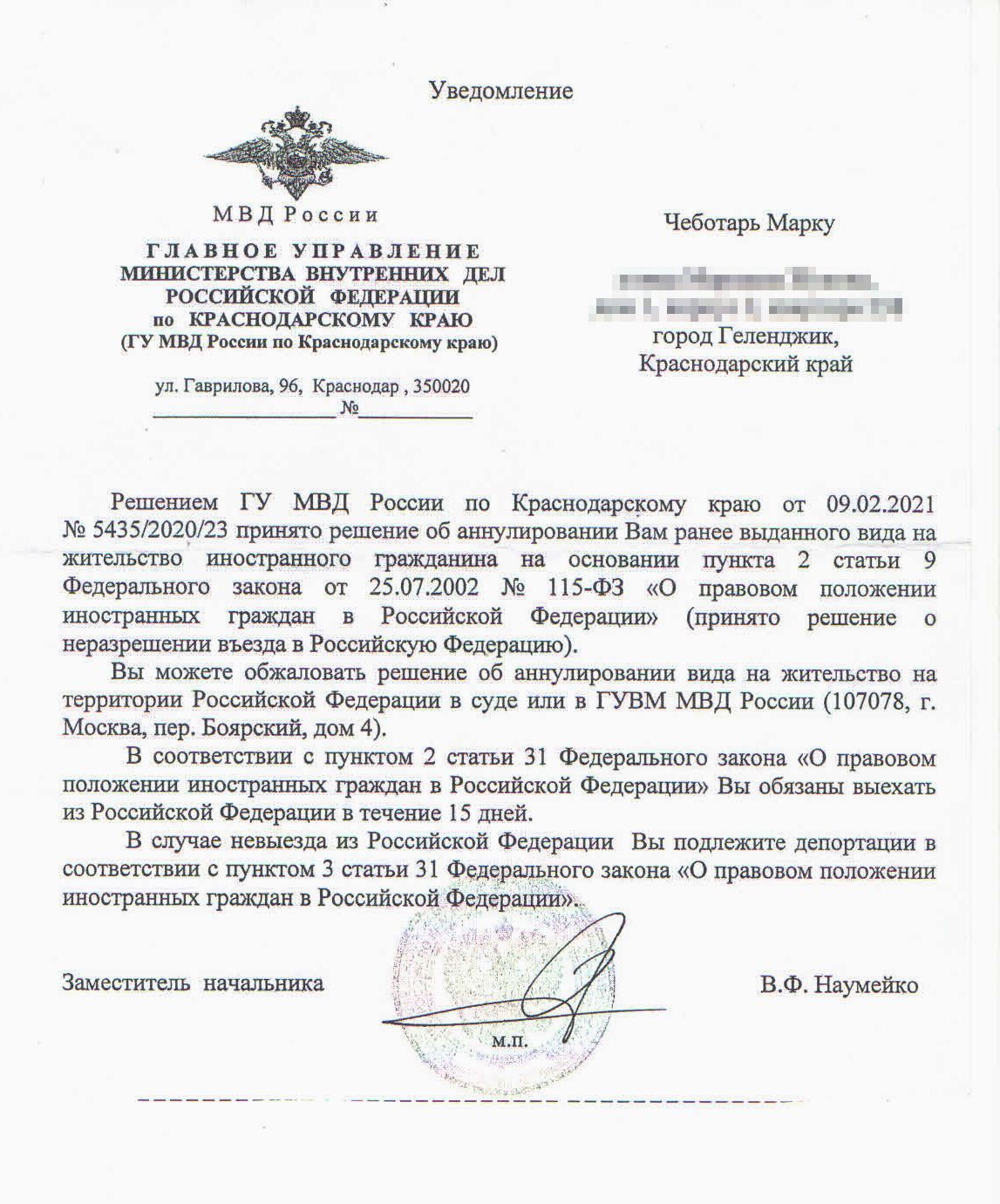 19 февраля его вызвали в геленджикское управление по вопросам миграции, где выдали уведомление без даты и номера: выписанный управлением МВД России по Краснодарскому краю запрет на въезд в Россию на пять лет и аннулирование ВНЖ. В уведомлении сказано, что Чеботарь должен покинуть территорию страны в течение 15 дней — в противном случае будет депортирован.