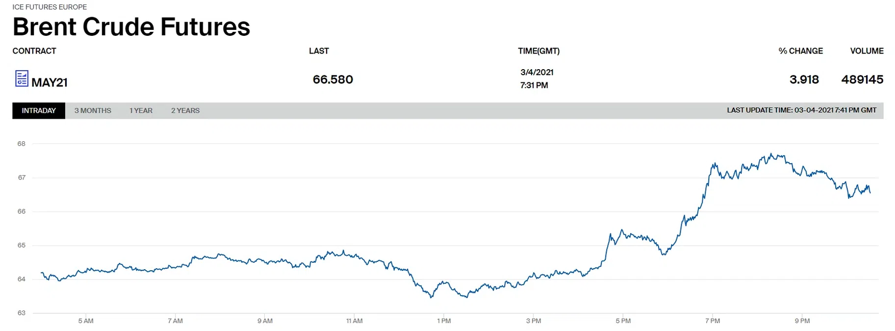 Цена на нефть поднялась до 67 долларов за баррель после решения ОПЕК+ не увеличивать добычу в апреле