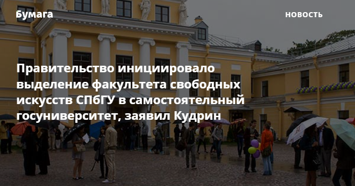 Правительство России инициировало выделение факультета свободных искусств и наук СПбГУ в самостоятельный государственный университет. Об этом в твиттере сообщил декан факультета — председатель Счетной палаты Алексей Кудрин.