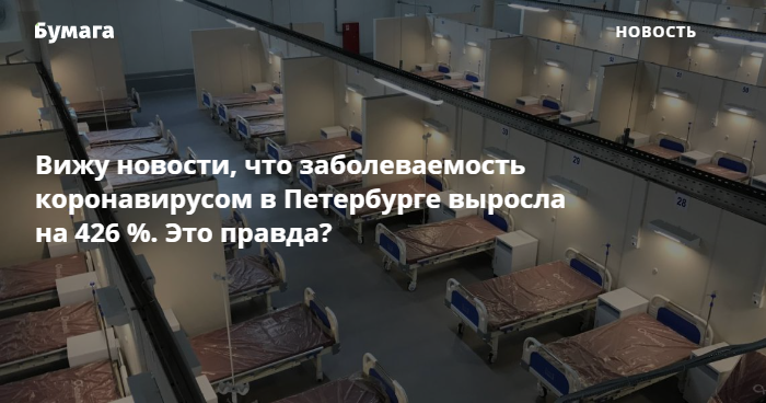 Петербургские СМИ массово сообщили, что в Петербурге на 426 % выросла заболеваемость коронавирусом. Это информация из информационной справки по противодействию эпидемии от Смольного, где сравниваются показатели обращений за медпомощью 3 марта и 24 февраля.