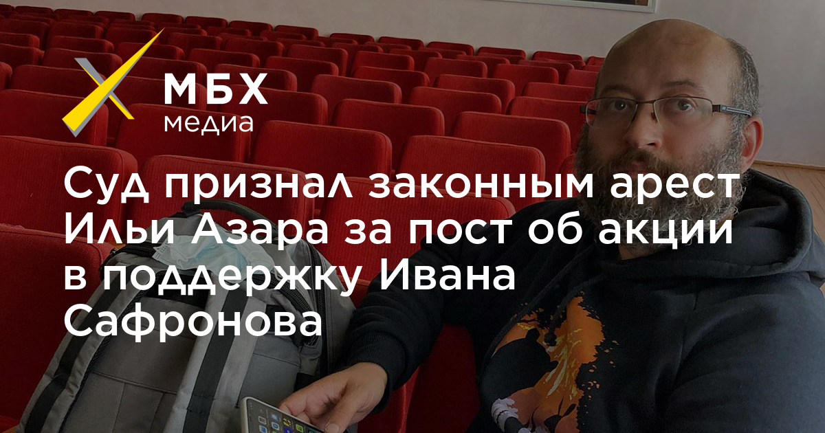 Московский городской суд оставил в силе арест на 15 суток специального корреспондента «Новой газеты» Ильи Азара по статье о повторном нарушении правил участия в акции за пост об июльской акции в поддержку Ивана Сафронова. Об этом «МБХ медиа» сообщили в пресс-службе суда.