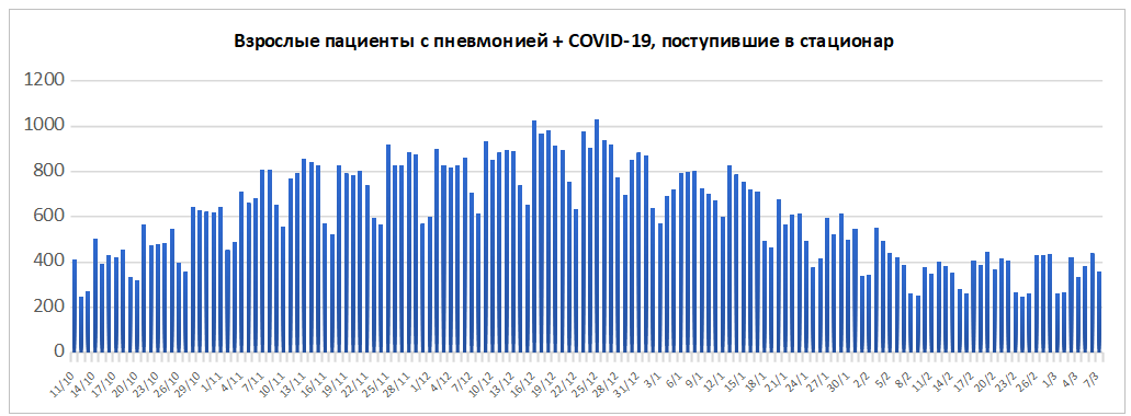 Сравнение недельных показателей госпитализации взрослых с коронавирусом показывает, что Петербург вышел на «высокое плато» по заболеваемости. Об этом говорится в информационной справке по противодействию эпидемии за 7 марта.
