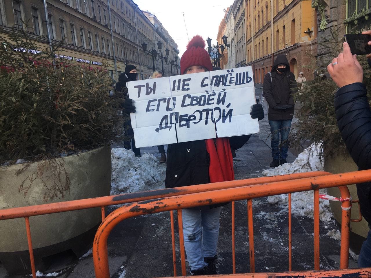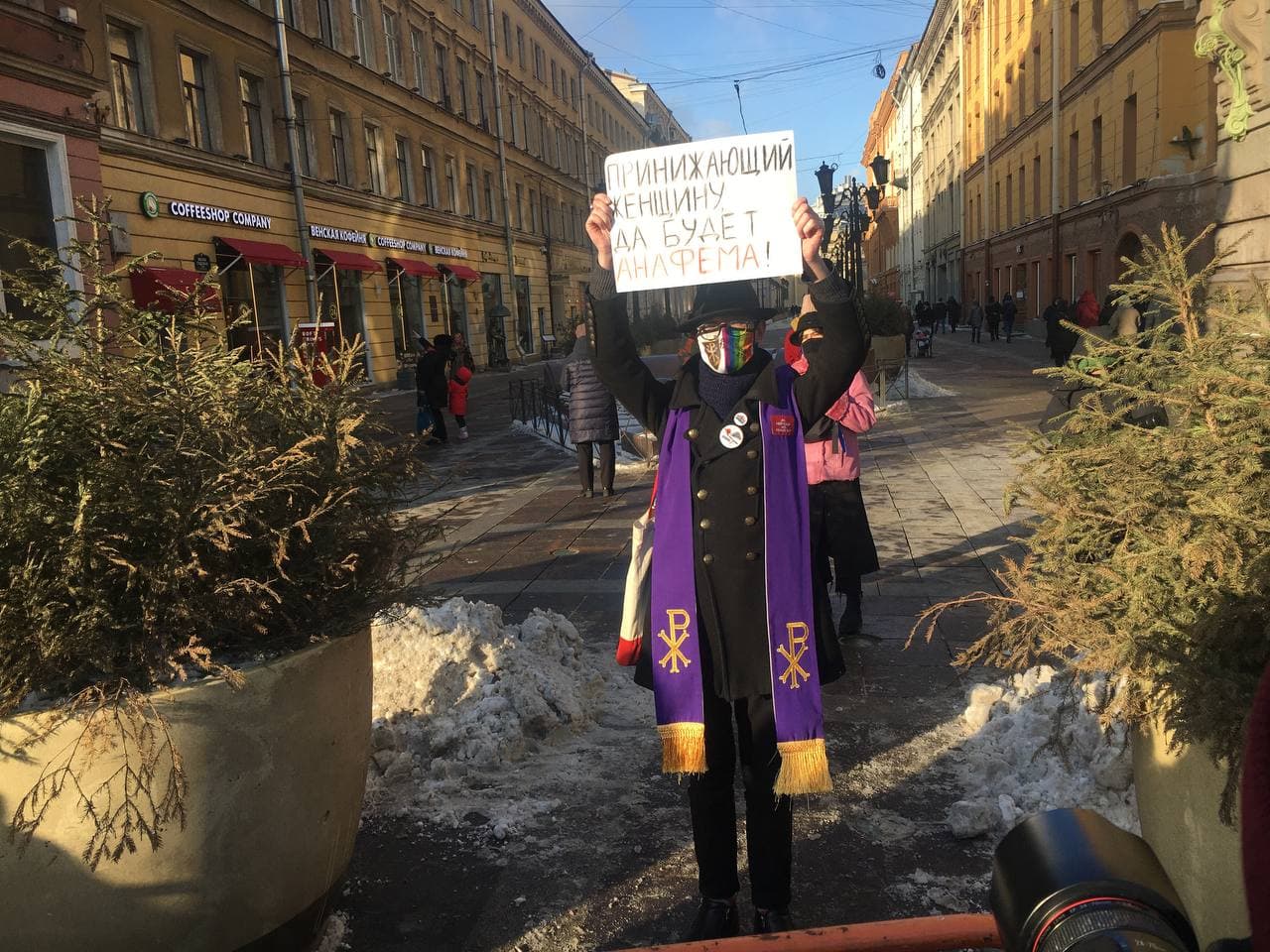 На площадь с плакатами вышли более 15 человек: женщины и мужчины. За час до начала одиночных пикетов феминистки устроили шествие по тротуарам Петербурга: они прошли от станции метро «Чернышевская» до Малой Садовой.
