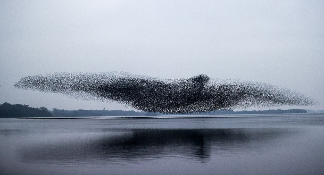 Этот снимок сделал фотограф Джеймс Кромби в начале марта над озером Лох-Эннел в Центральной Ирландии. Скворцы собираются в такие огромные стаи (до 700 тысяч птиц) перед гнездованием. Подобную стаю традиционно называют murmuration of starlings, то есть «шелест» или «шепот скворцов» (от характерного звука крыльев).