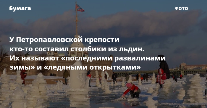 На берегу у Петропавловской крепости в Петербурге заметили столбики, составленные из плоских льдин. Горожане публикуют фотографии в соцсетях.