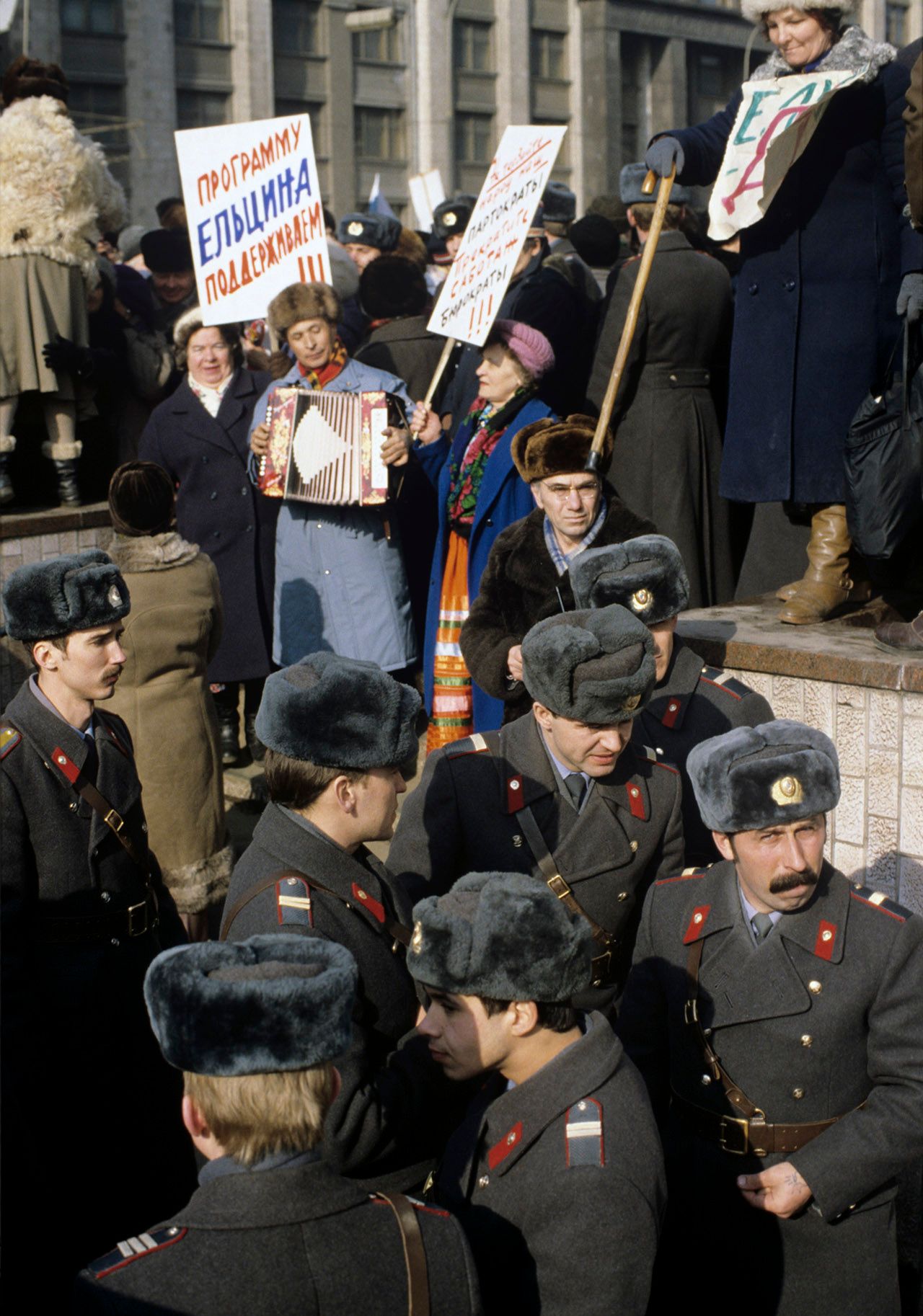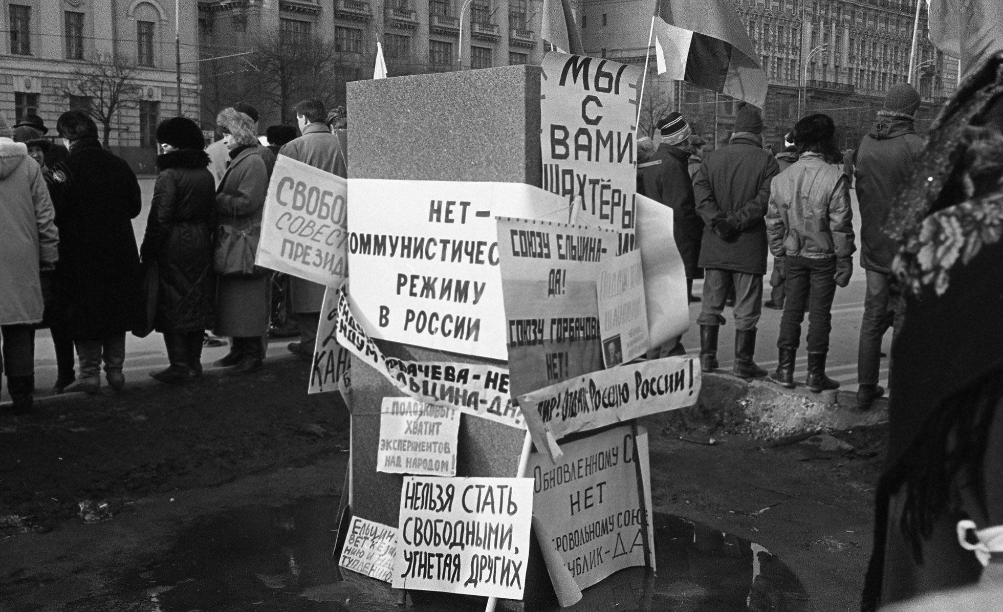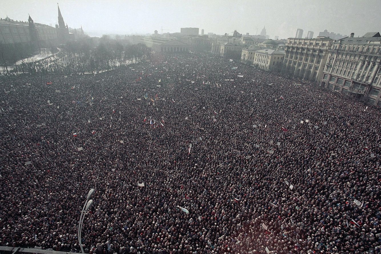On March 10, 1991, a major opposition demonstration took place in the center of Moscow. Though estimates of the crowd size vary, the rally remains one of the largest protests in Russia’s modern history. As many as half a million people filled Moscow’s Manezhnaya Square near the Kremlin, demanding the resignation of Soviet President Mikhail Gorbachev and expressing their support for Boris Yeltsin, who would go on to become the first president of the independent Russian Federation. The demonstration was also a protest against the preservation of the USSR — a question at the center of a referendum that would take place a week later. In that vote, most Soviet citizens endorsed the Union’s continued existence, but the country and its empire nevertheless collapsed later that year.