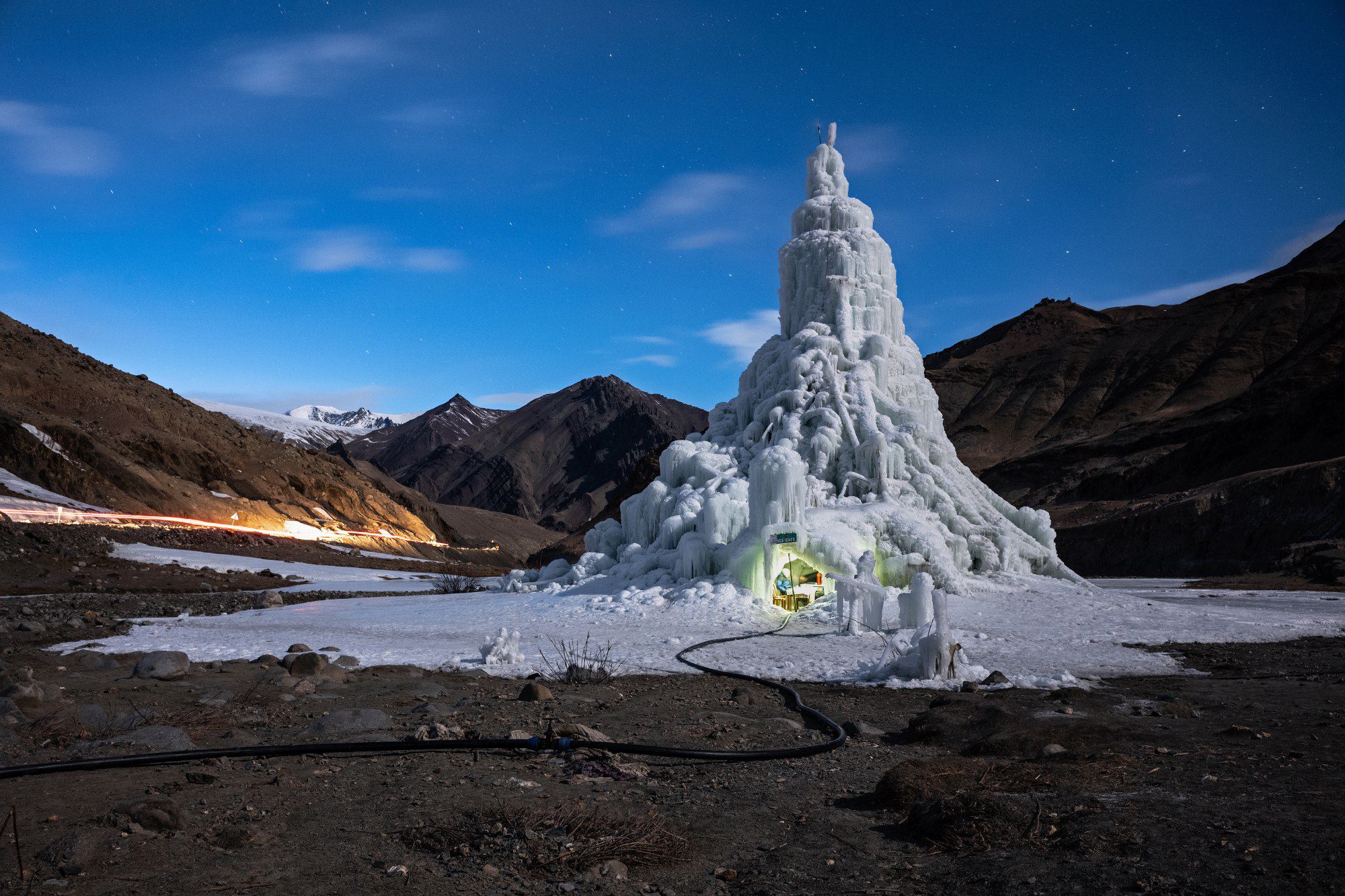 Номинант в категории «Окружающая среда» среди фотоисторий. «Боремся с изменением климата — создаем свои ледники». Ладакх, Гималаи. Снежный конус — это первое ледяное кафе в Индии, накапливающее зимнюю талую воду и выпускающее ее весной, когда она нужна деревням с острой нехваткой воды. В 2020 году такие конусы были установлены в 26 деревнях