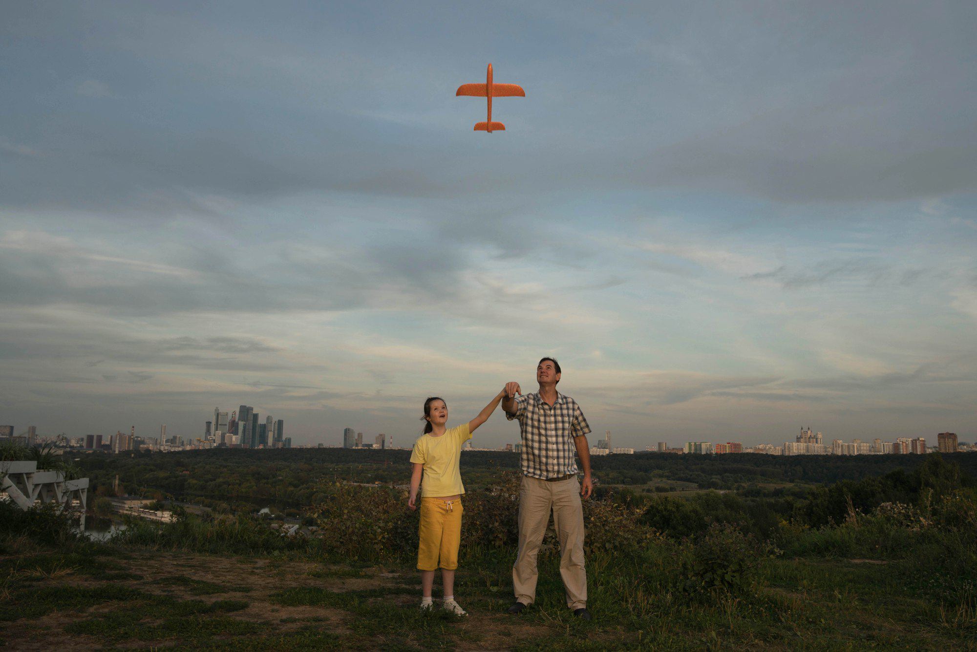 Номинант в категории «Портреты» среди одиночных фотографий. «В полете». Москва, 23 августа 2020 года. Отец учит Ксению (10 лет) запускать игрушечный самолет. У девочки расстройство аутистического спектра, которое в России часто плохо диагностируют. Родители детей с РАС испытывают трудности с поиском программ поддержки