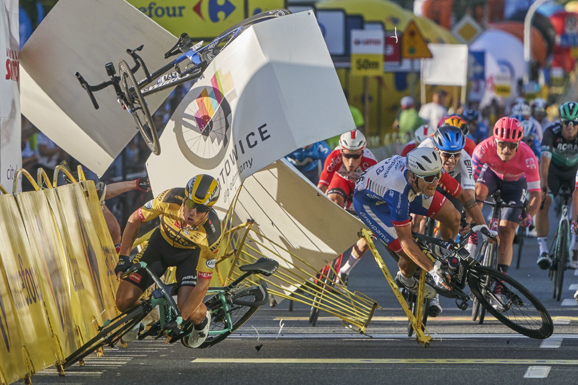 Номинант в категории «Спорт» среди одиночных фотографий. «Велокатастрофа», Катовице, Польша, 5 мая. Голландский велосипедист Дилан Гроеневеген (слева) разбивается за несколько метров до финиша после столкновения с другим членом команды, Фабио Якобсеном, во время первого этапа Тура Польши. Они боролись за первое место на первом этапе и ехали со скоростью около 80 километров в час. Гроеневеген сломал ключицу и был дисквалифицирован на гонке. Якобсен получил тяжелые травмы, перенес пятичасовую операцию, неделю провел в реанимации. Ему присудили первое место