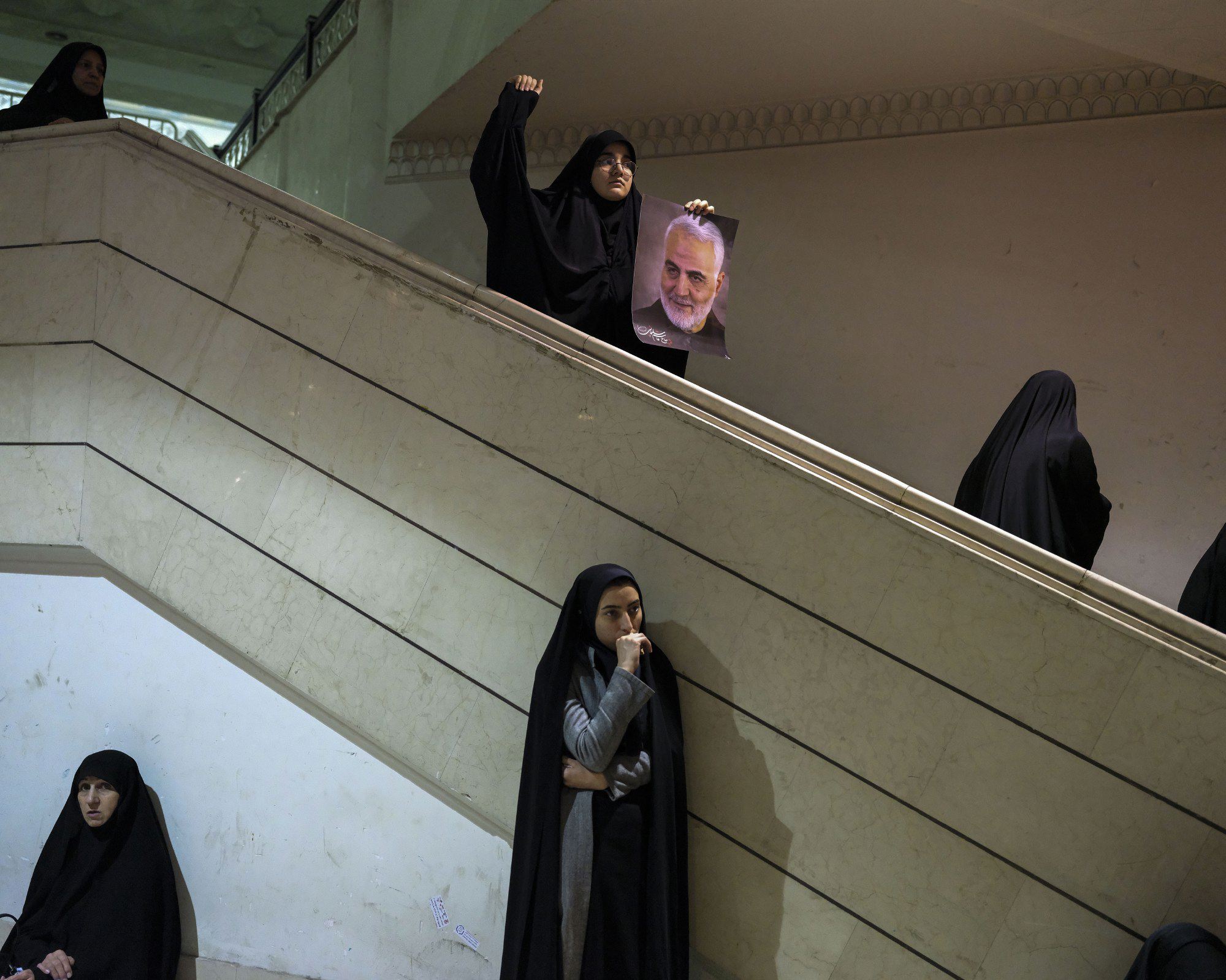 Номинант в категории «Главные новости» среди одиночных фотографий. Церемония оплакивания Касема Сулеймани. 5 января, Тегеран. Женщины в мечети оплакивают смерть генерал-майора Касема Сулеймани, который был убит 3 января 2020 года в аэропорту Багдада вместе с другими поддерживаемыми Ираном ополченцами в результате воздушного удара по приказу президента США Дональда Трампа. Сулеймани широко известен в Иране как национальный герой