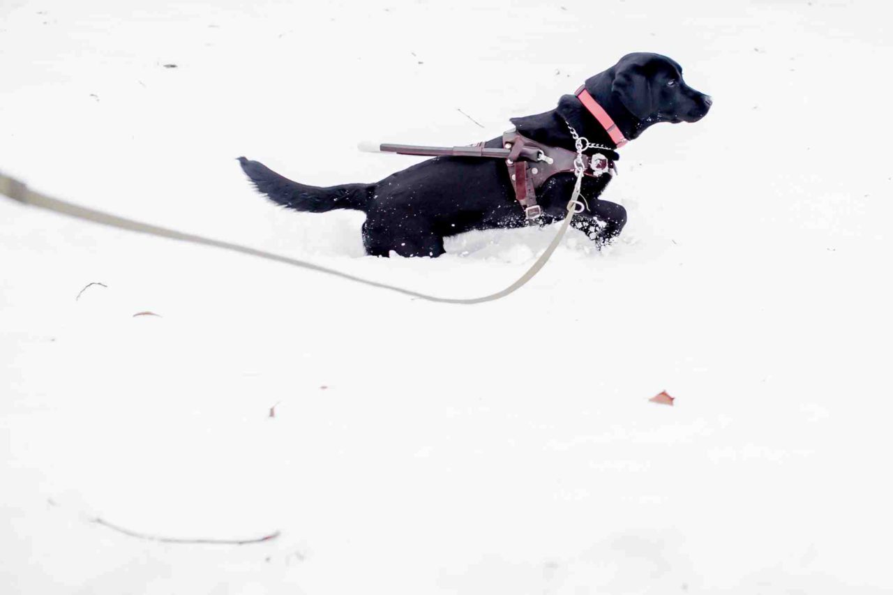 Грейси гуляетФото: Анна Иванцова для ТД Когда мы проходим через большую лужу, Грейси заходит лапами в грязную воду, давая Юле пройти по тонкому перешейку. Ближе к метро уже очередь Юли проявить заботу. Она сворачивает на бульвар и говорит «Гулять!», после чего отпускает шлейку, давая собаке-поводырю возможность прыгнуть в сугроб.