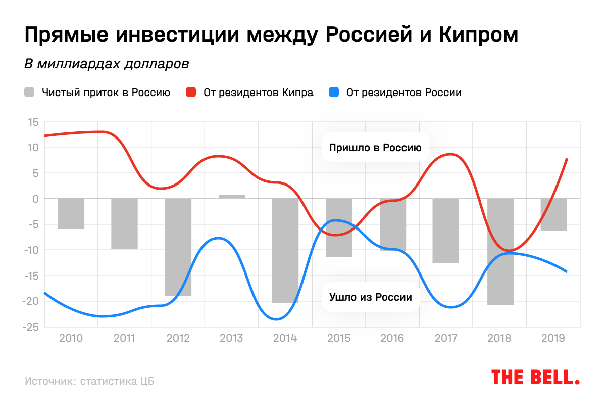 За последние 10 лет (за исключением 2013 года) в России всегда был чистый отток денег на Кипр: выводили больше, чем возвращали. Отчасти это может объясняться тем, что выведенные на Кипр доходы текли дальше, в другие офшоры. Возможно, потом что-то даже приходило в Россию оттуда.