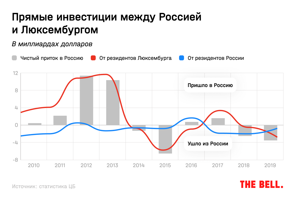 После введения санкций в 2014 году сохранялся либо чистый отток (в 2014–2015, 2018–2019), либо совсем небольшой чистый приток (2016–2017) из Люксембурга в Россию.