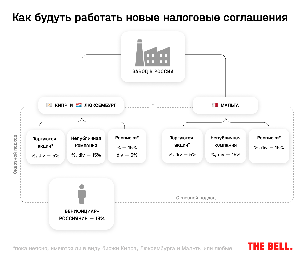 - Мальта. Сценарий был очень похож на кипрский: в июне Россия заявила о планах разорвать соглашение с Мальтой, а уже в августе страна «в целом согласилась» на российские условия. Протокол с изменениями Россия и Мальта подписали в октябре. Новые ставки уже действуют.