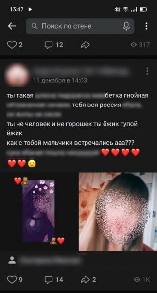 Согласно скриншотам трех постов, которые МВД приложило к пресс-релизу, два из них в паблике «Подслушано »; найти третий не удалось. «Ты не человек и не горошек ты ежик тупой ежик как с тобой мальчики встречались ааа???» — в одном из постов с фотографией девочки.