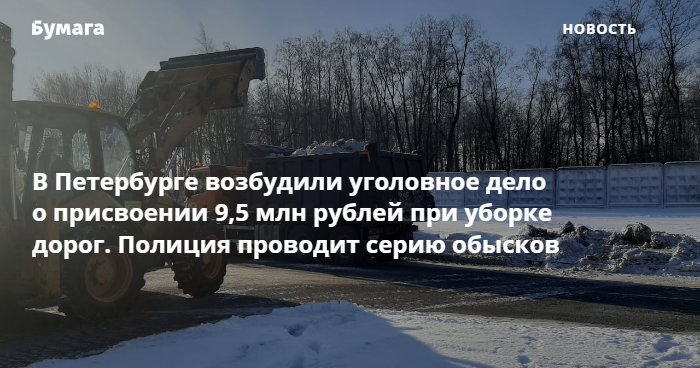 Полиция Петербурга проводит обыски по уголовному делу о растрате (ч. 4 ст. 160 УК РФ) около 9,5 миллиона рублей при уборке дорог. У предполагаемых фигурантов изъяли крупную сумму денег и документацию, сообщили «Бумаге» в пресс-службе ГУ МВД по городу и области.