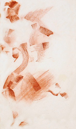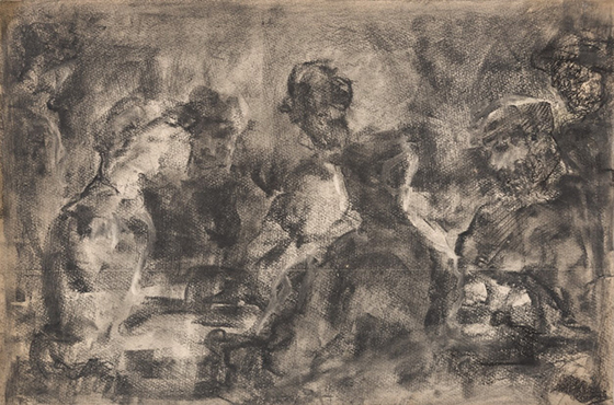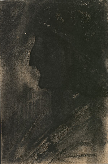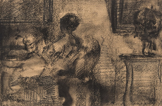 © Собрание Михаила Анкудинова Василий Калужнин. Разговор. 1930-е годы. Бумага, уголь, соус Каждая работа Калужнина предполагала путь, который всегда начинался с чего-то неблагоприятного, но в результате приводил к нужному результату. Живописность, красота обнаруживались там, где другие ничего такого не видели. Выяснялось, что черный цвет может быть пластичным, а пустынное пространство — буквально насыщенным энергией.