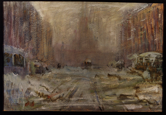 © Собрание Семена Ласкина Василий Калужнин. Городской пейзаж. 1930. Бумага, масло, гуашь В свою веру Василий Павлович пытался обратить своих воспитанников по Ленинградскому среднему художественному училищу. Студенты стремились соответствовать. Хотя они не видели работ учителя, но шли по его пути: в черном искали светлое, в пустынном — заполненное.