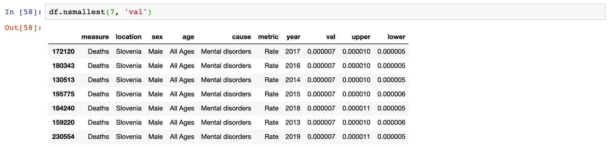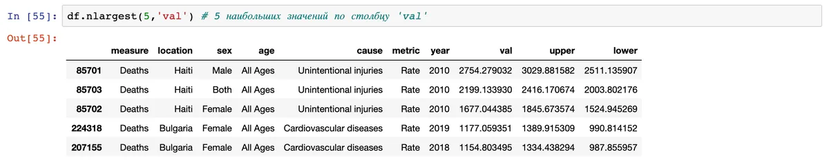 Иногда бывает удобно не сортировать весь датафрейм, а только посмотреть самые крупные и мелкие значения. Для этого есть методы nlargest() и nsmallest(). В параметрах можно задать число (сколько строк нужно вывести) и название столбца.
